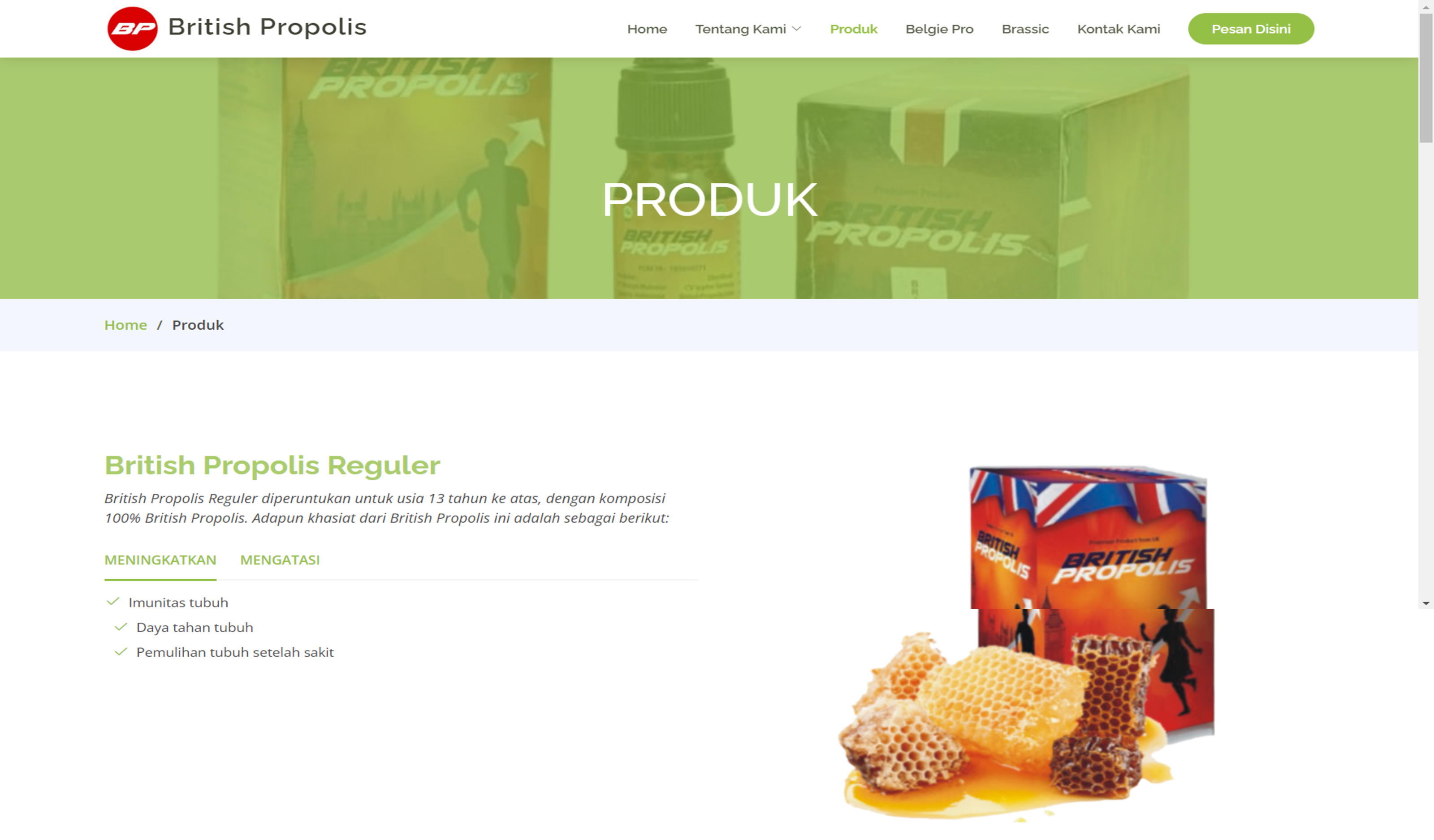 - Product Catalog: Displays detailed information and promotions for various products such as British Propolis, Belgie Pro, and Brassic.