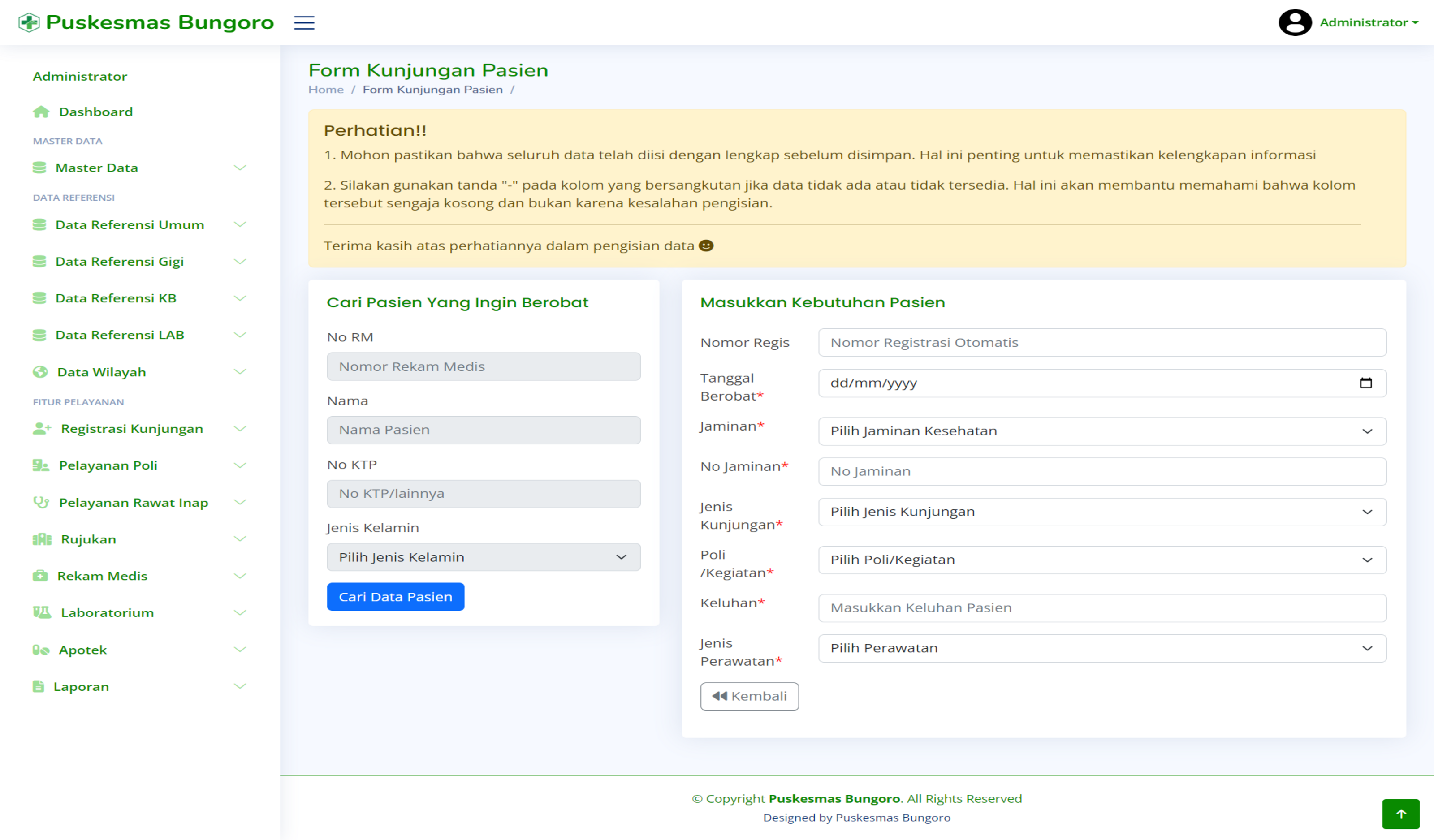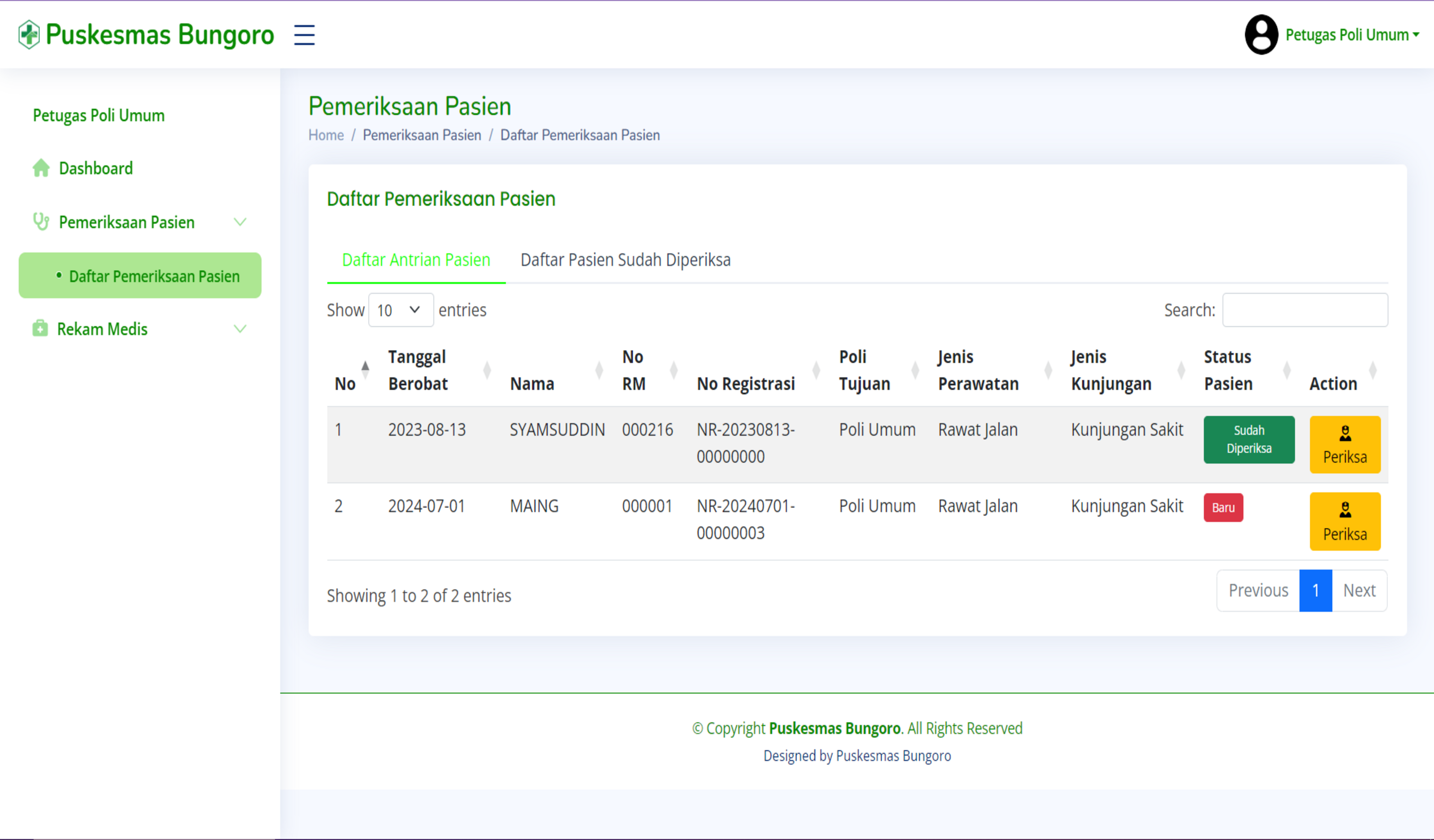 This project is a comprehensive health management system developed for Puskesmas Bungoro, Kabupaten Pangkep. The system is designed to streamline various healthcare processes, providing an efficient and user-friendly platform for both staff and administrators. Key features include:
