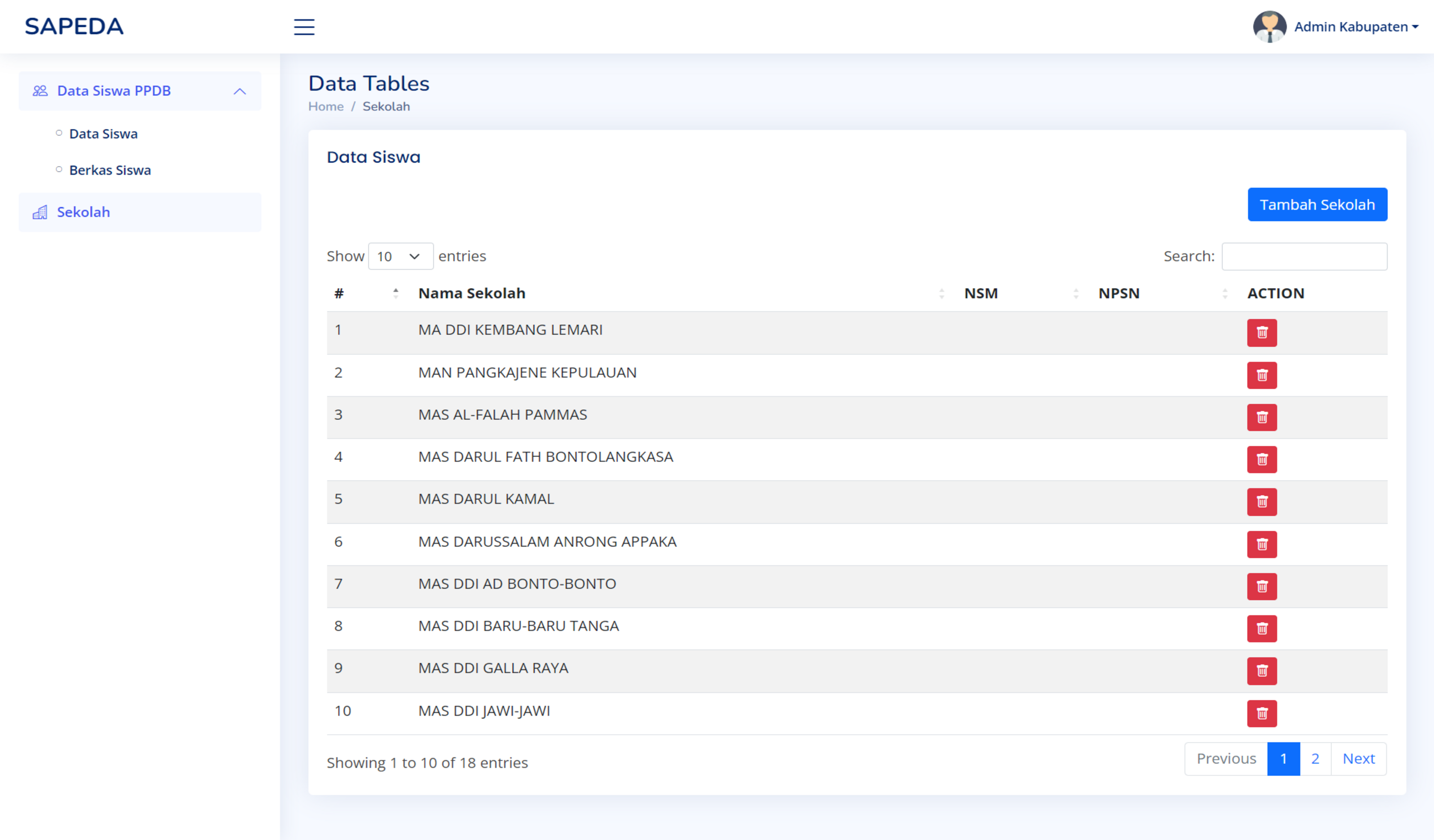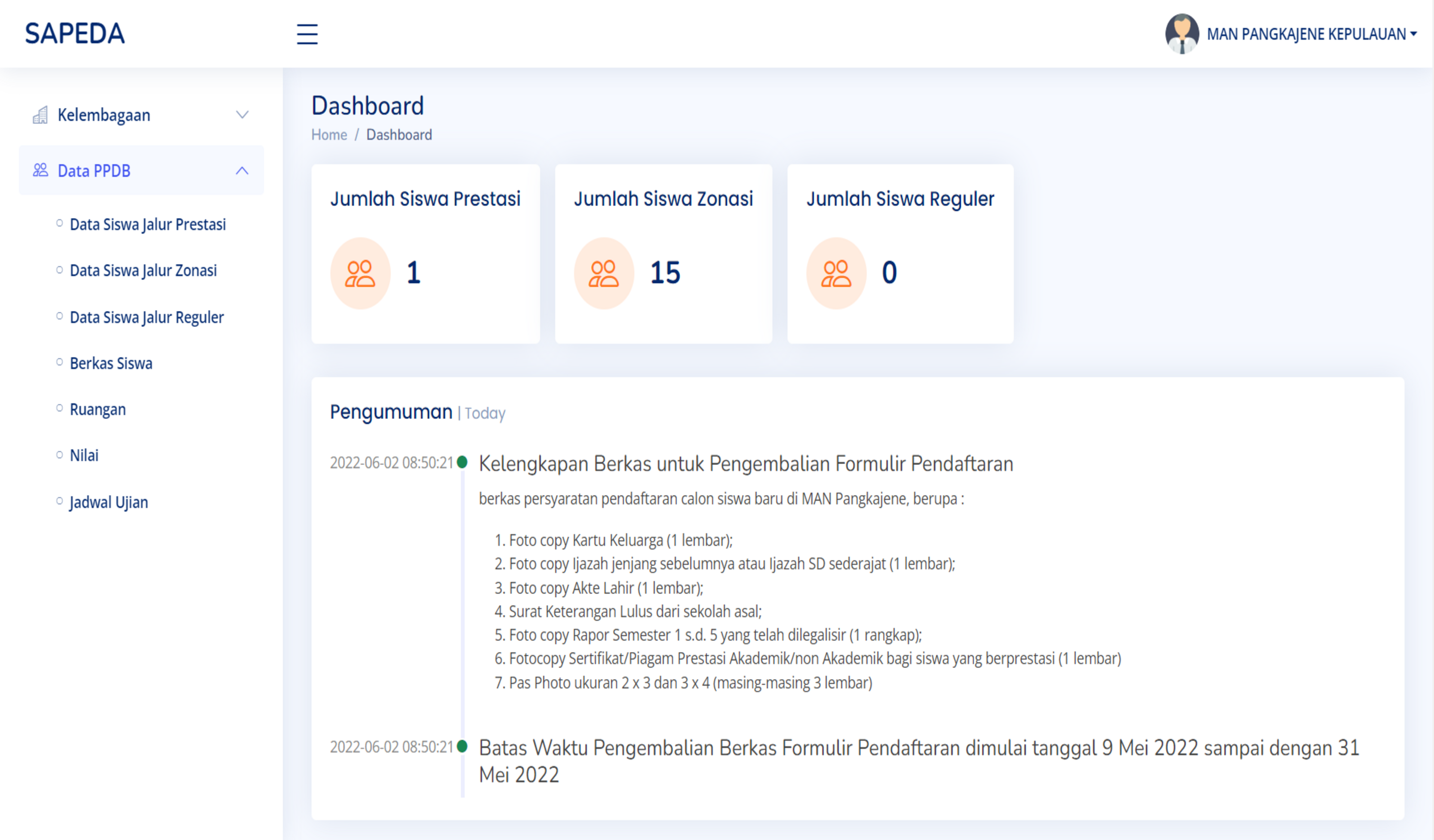 This project is a New Student Enrollment System developed for Madrasah Aliyah schools across Kabupaten Pangkep. The system is designed to streamline and automate the student admission process, offering an efficient and transparent platform for both school administrators and students. The system supports multiple user roles, including: